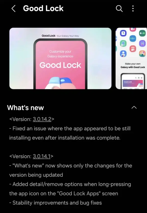 Good Lock là bộ công cụ tùy chỉnh mạnh mẽ giúp người dùng cá nhân hóa gần như mọi chi tiết trên điện thoại Samsung, từ màn hình khóa, giao diện chính cho đến thông báo. Tuy nhiên, một số người dùng gần đây gặp tình trạng các module hiển thị đang cài đặt dù đã hoàn tất quá trình, gây nhầm lẫn khi kiểm tra trạng thái. Samsung cho biết phiên bản Good Lock 3.0.14.2 đã khắc phục lỗi này, đảm bảo các module hiển thị chính xác trạng thái cài đặt trong mục Plugins.