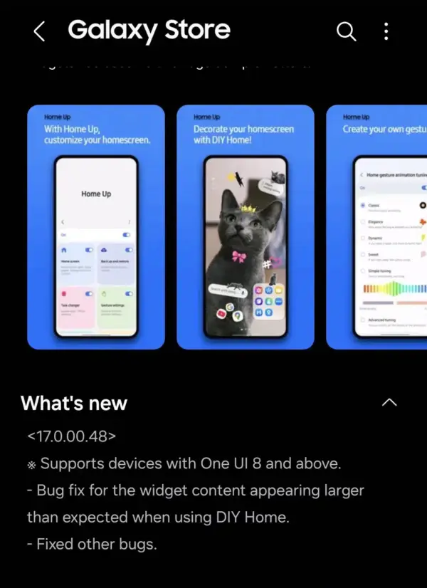 Trong khi đó, Home Up – một phần của hệ sinh thái Good Lock – mang đến nhiều tùy chọn tùy chỉnh màn hình chính, bao gồm hiệu ứng thư mục, cử chỉ vuốt, bảng cạnh và đặc biệt là tính năng DIY Home, cho phép người dùng sắp xếp, di chuyển và thay đổi kích thước widget linh hoạt. Tuy nhiên, một số người dùng báo cáo rằng widget hiển thị to hơn bình thường, khiến bố cục màn hình mất cân đối. Với bản cập nhật Home Up 17.0.00.48, Samsung đã khắc phục vấn đề này, giúp widget hiển thị đúng tỷ lệ và màn hình trông gọn gàng hơn.