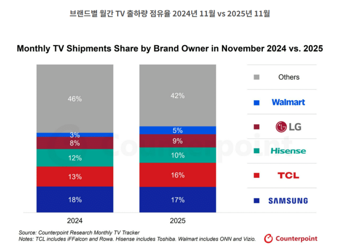 Theo Counterpoint Research, tính đến tháng 11 năm 2025, Samsung chiếm 17 phần trăm thị phần TV toàn cầu, qua đó duy trì ngôi đầu bảng. Tuy nhiên, lượng TV xuất xưởng của hãng giảm 3 phần trăm so với cùng kỳ năm trước, khiến thị phần giảm từ 18 phần trăm xuống còn 17 phần trăm.