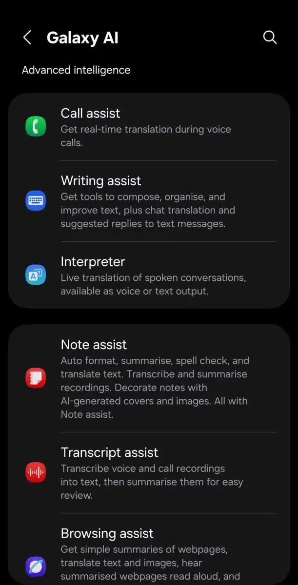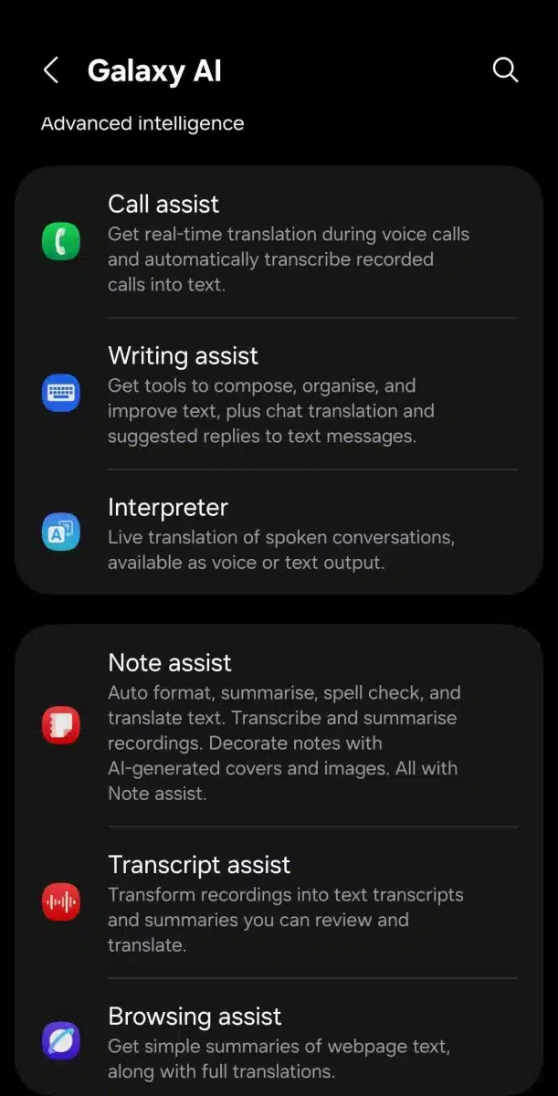 1. Call Assist (Hỗ trợ cuộc gọi/Live Translate): Dịch ngôn ngữ hai chiều theo thời gian thực trong cuộc gọi thoại. Người dùng có thể nói bằng tiếng mẹ đẻ và đầu bên kia sẽ nghe bản dịch, đồng thời nội dung cũng hiển thị trên màn hình.