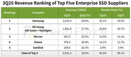 Theo báo cáo từ TrendForce công bố ngày 5 tháng 12, tổng doanh số của top 5 thương hiệu eSSD trong quý 3 năm nay đạt 6.54 tỷ USD, tăng 28% so với quý trước. TrendForce cho biết sự mở rộng đồng thời của hạ tầng AI và hệ thống máy chủ truyền thống từ các nhà cung cấp dịch vụ đám mây tại Bắc Mỹ đã thúc đẩy cả lượng xuất xưởng và giá bán eSSD tăng mạnh. Giá hợp đồng trung bình của eSSD được dự báo sẽ tiếp tục tăng hơn 25% trong quý 4.