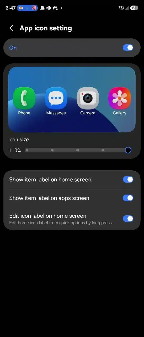 Home Up trên One UI 8.5 cho phép đổi tên các biểu tượng ứng dụng ngay trên màn hình chính. Người dùng có thể tùy ý chỉnh lại nhãn ứng dụng theo thói quen cá nhân, từ việc đổi X thành Twitter cho đến rút gọn các tên dài như Telegram Beta. Ngoài nội dung hiển thị, màu chữ của nhãn ứng dụng cũng có thể thay đổi, giúp giao diện linh hoạt và mang dấu ấn cá nhân rõ ràng hơn.