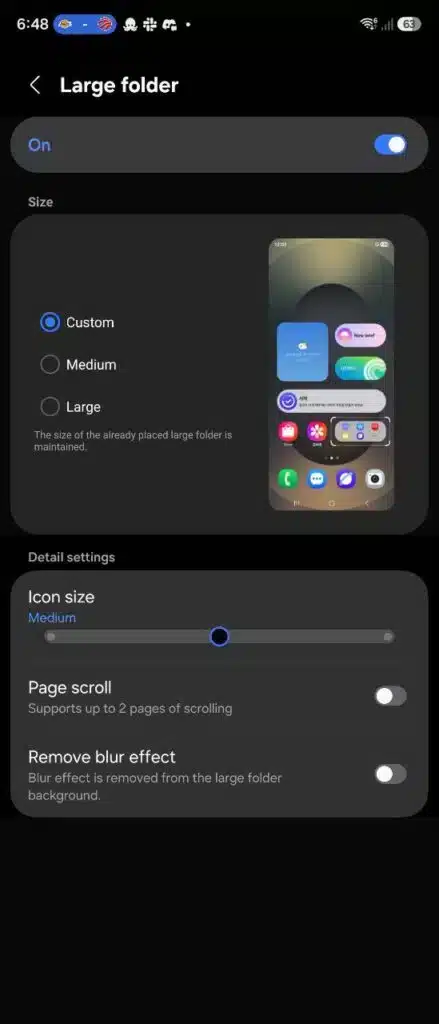 Một điểm mới đáng chú ý khác là khả năng điều chỉnh kích thước các thư mục lớn trên màn hình chính. Người dùng có thể thu nhỏ hoặc phóng to thư mục tùy nhu cầu, từ đó sắp xếp được nhiều ứng dụng hơn hoặc chừa thêm không gian cho widget và hình nền.