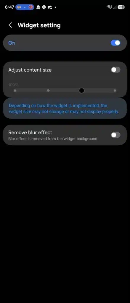 Song song với đó, Home Up cũng bổ sung tùy chọn điều chỉnh tỷ lệ hiển thị của widget, giúp các widget bên thứ ba không còn quá nhỏ hoặc quá to. Với widget do Samsung phát triển, người dùng còn có thể tắt hiệu ứng làm mờ nền, mang lại giao diện gọn gàng và rõ ràng hơn.