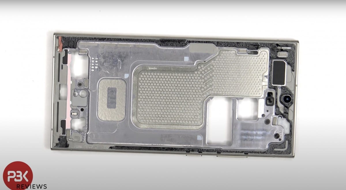 Có thể thấy bên dưới pin là buồng hơi tản nhiệt lớn, kéo dài đến phía dưới bo mạch chủ. Theo Samsung, buồng hơi này có kích thước gần gấp đôi (1,9 lần) so với trên Galaxy S23 Ultra. Điều này giúp điện thoại luôn được làm mát trong quá trình sử dụng, tránh hiện tượng quá nhiệt, giảm hiệu suất.